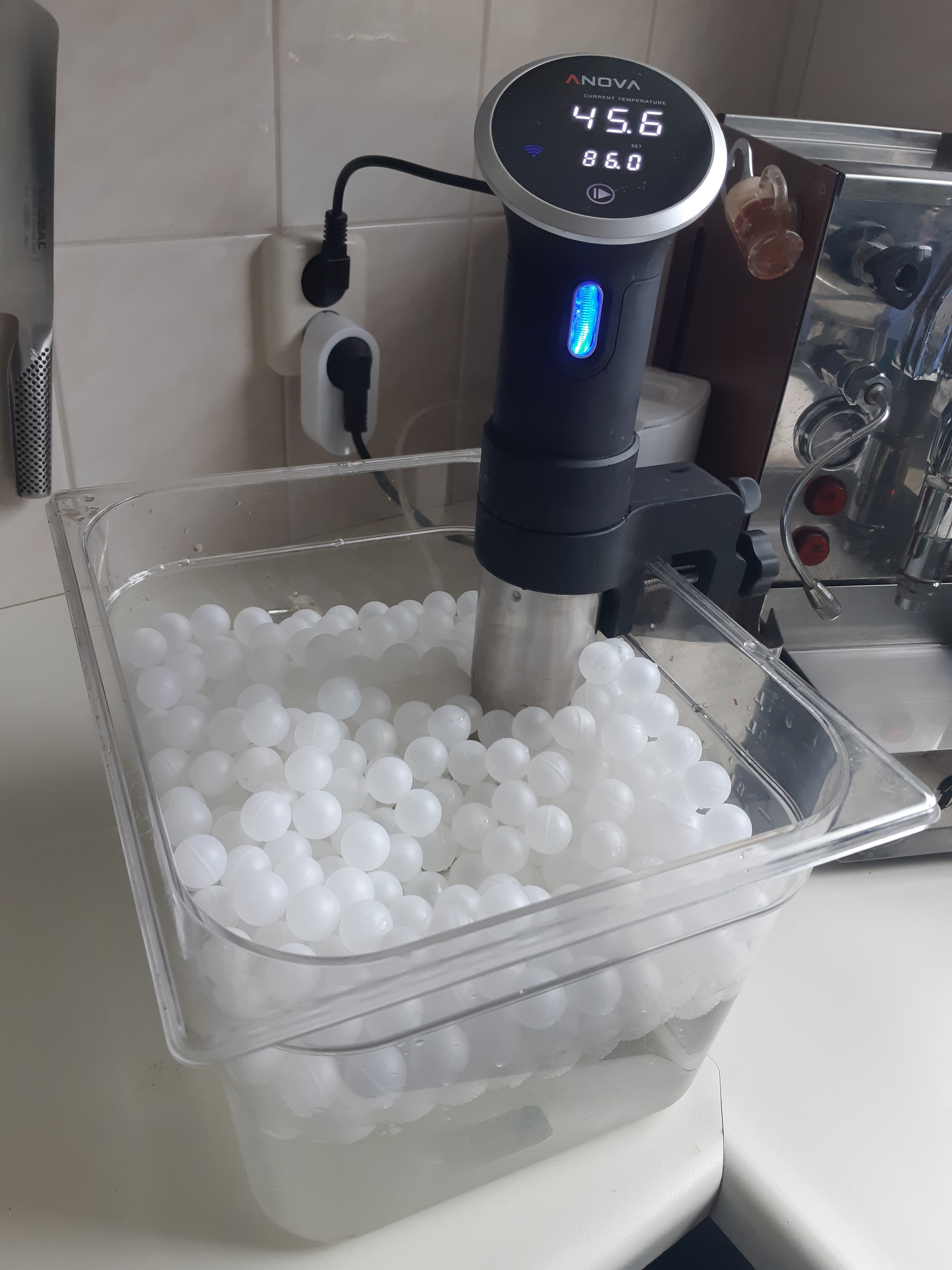 - Begin met je waterbad, stel deze in op 86 graden. Dat is vrij warm, je apparaat zal dan ook substantieel meer tijd nodig hebben dan bij een badje van 55 graden. Stel de timer, als je die hebt, in op 45 minuten. Ik gebruik kleine pingpongballen als isolator, dat scheelt echt fors bij dit soort bereidingen.